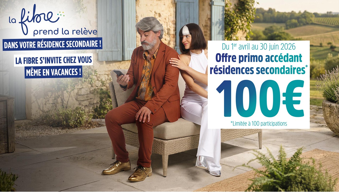 Offre de remboursement conditionnée à l’éligibilité de votre commune à cet avantage. Offre de remboursement valable pour une première souscription auprès du fournisseur d’accès de votre choix à un abonnement à la fibre optique FTTH. Première souscription réalisée entre le 01/04/26 au 30/06/26 inclus. Remboursement conditionné à un raccordement à la fibre réalisé par votre fournisseur d’accès au plus tard le 31/08/26. Offre de remboursement, limitée aux 100 premières demandes, consécutive à une première facturation par le fournisseur d’accès choisi. Remboursement par virement bancaire de 100€ au plus tard 6 semaines après validation de votre dossier, pour toute demande complète et conforme, complétée avant le 30/09/26. Toute demande incomplète sera rejetée. Plus d’information sur https://promos.lafibreprendlareleve.com/residencesecondaire